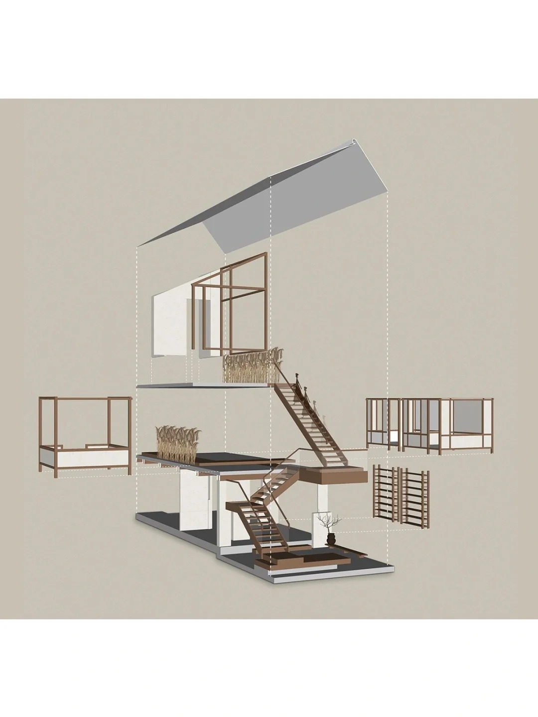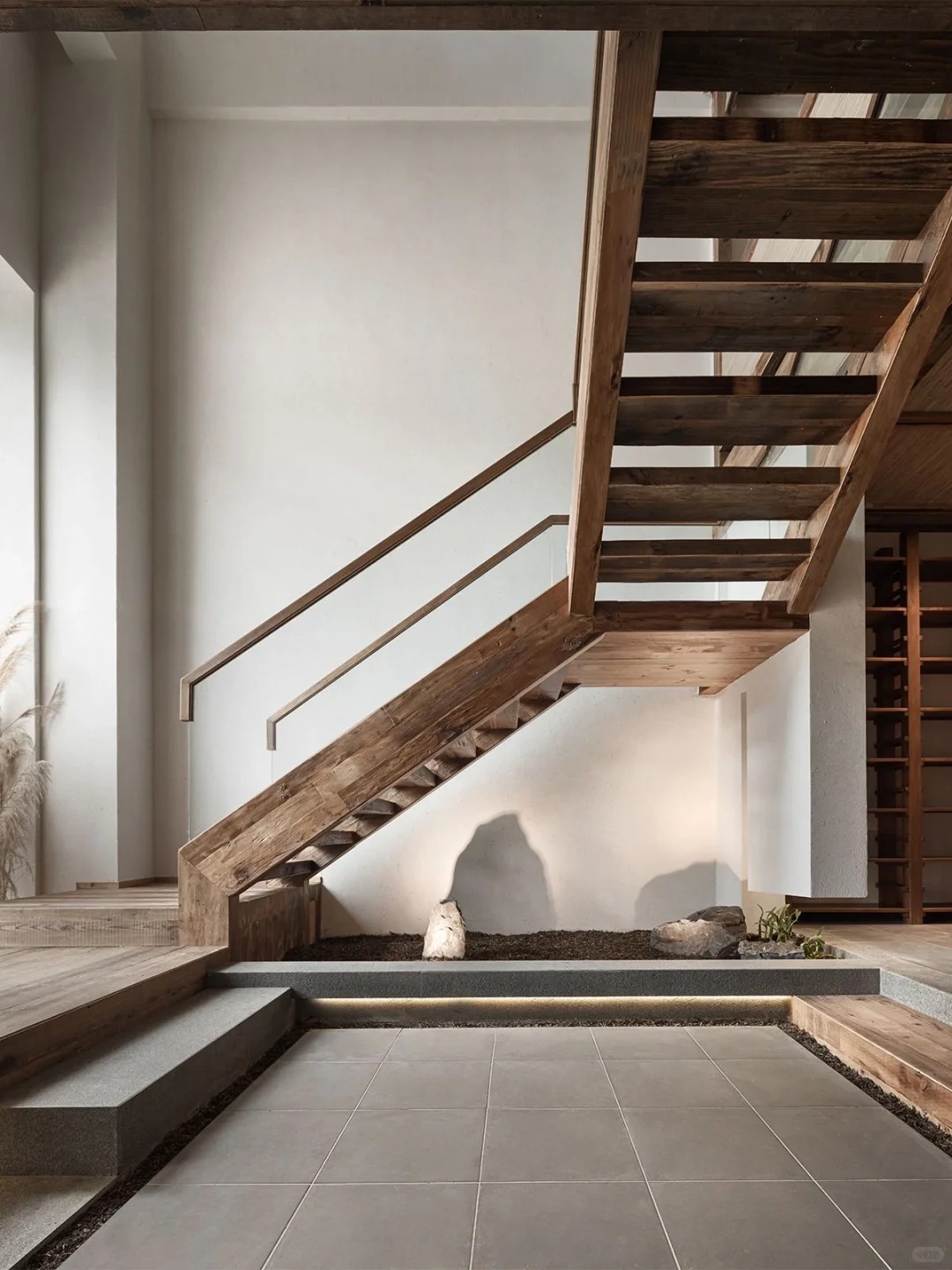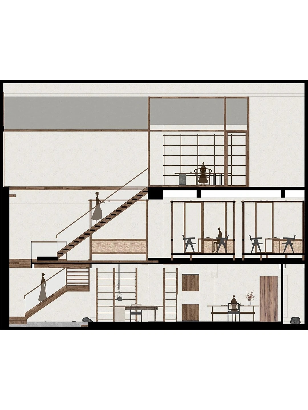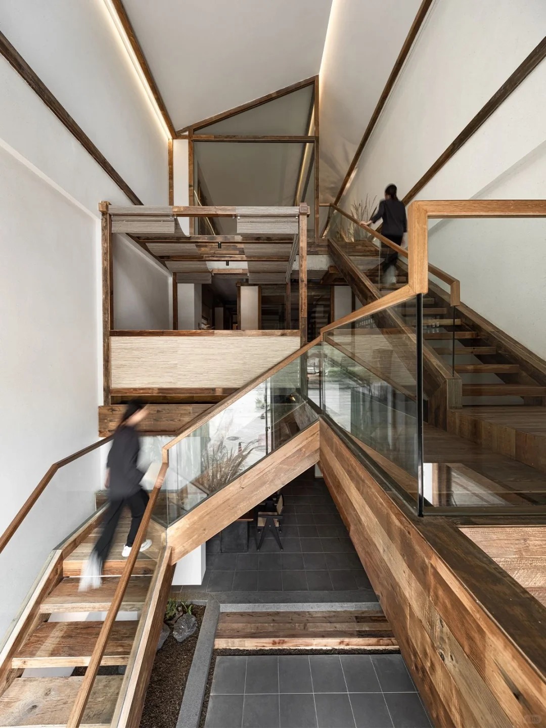 我们运用了东西方绘画构图法则做结合,一点透视做视觉聚焦,三点透视做空间组合,使原本单一的使用场景更多样有趣。通过错呈式布局,整个空间由楼梯贯穿,既封闭又开放,错落的阶梯设计遵循云南当地的村貌特征,如同层层叠进的栈道,将记忆瞬间拉回熟悉的普洱村落古道。