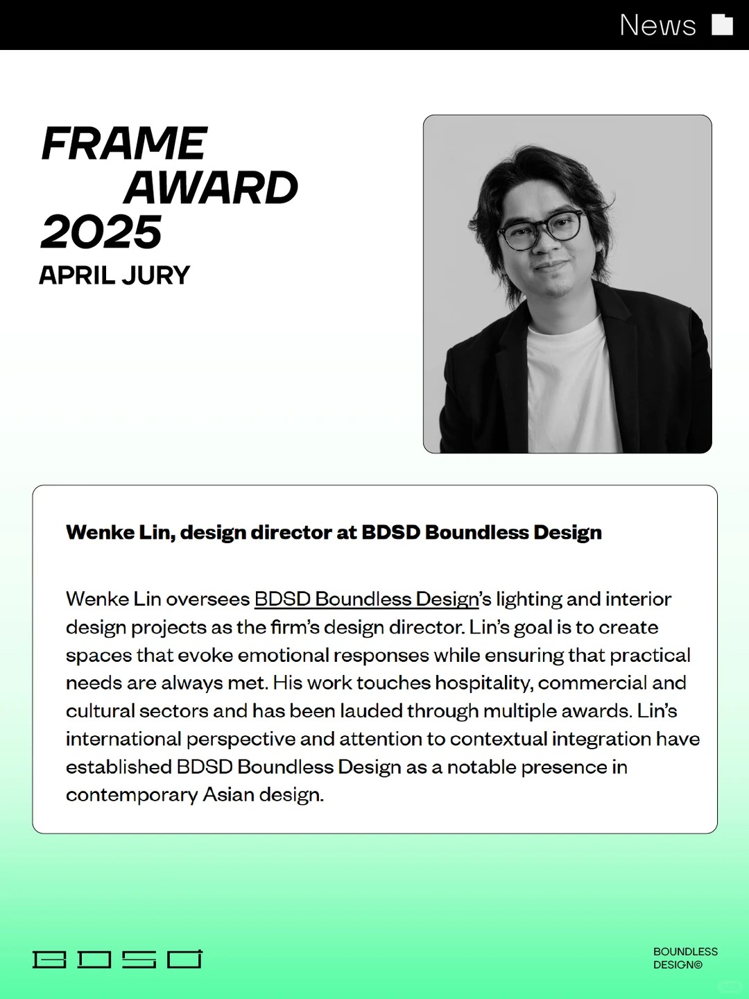 国际权威设计媒体FRAME(构架)于近日公布了2025 FRAME AWARDS 4月评审团名单,BDSD吾界设计创始人兼设计总监林文科先生荣膺国际评委席位,将为全球顶级室内设计大奖FRAME AWARDS注入中国设计视角。
