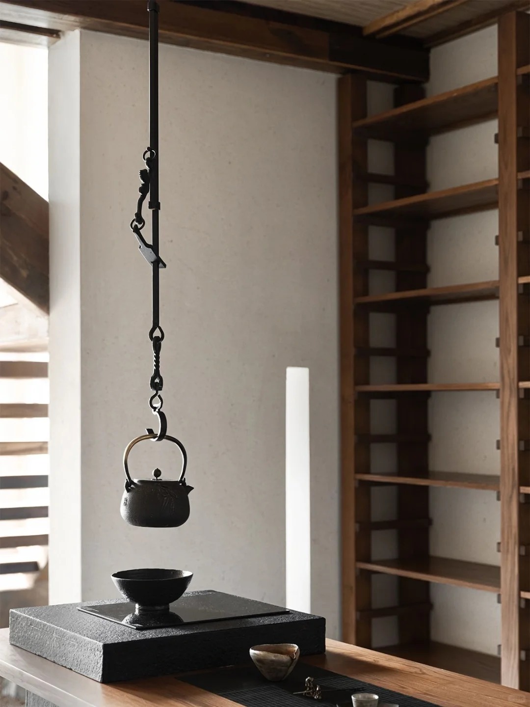 我们运用了东西方绘画构图法则做结合,一点透视做视觉聚焦,三点透视做空间组合,使原本单一的使用场景更多样有趣。通过错呈式布局,整个空间由楼梯贯穿,既封闭又开放,错落的阶梯设计遵循云南当地的村貌特征,如同层层叠进的栈道,将记忆瞬间拉回熟悉的普洱村落古道。